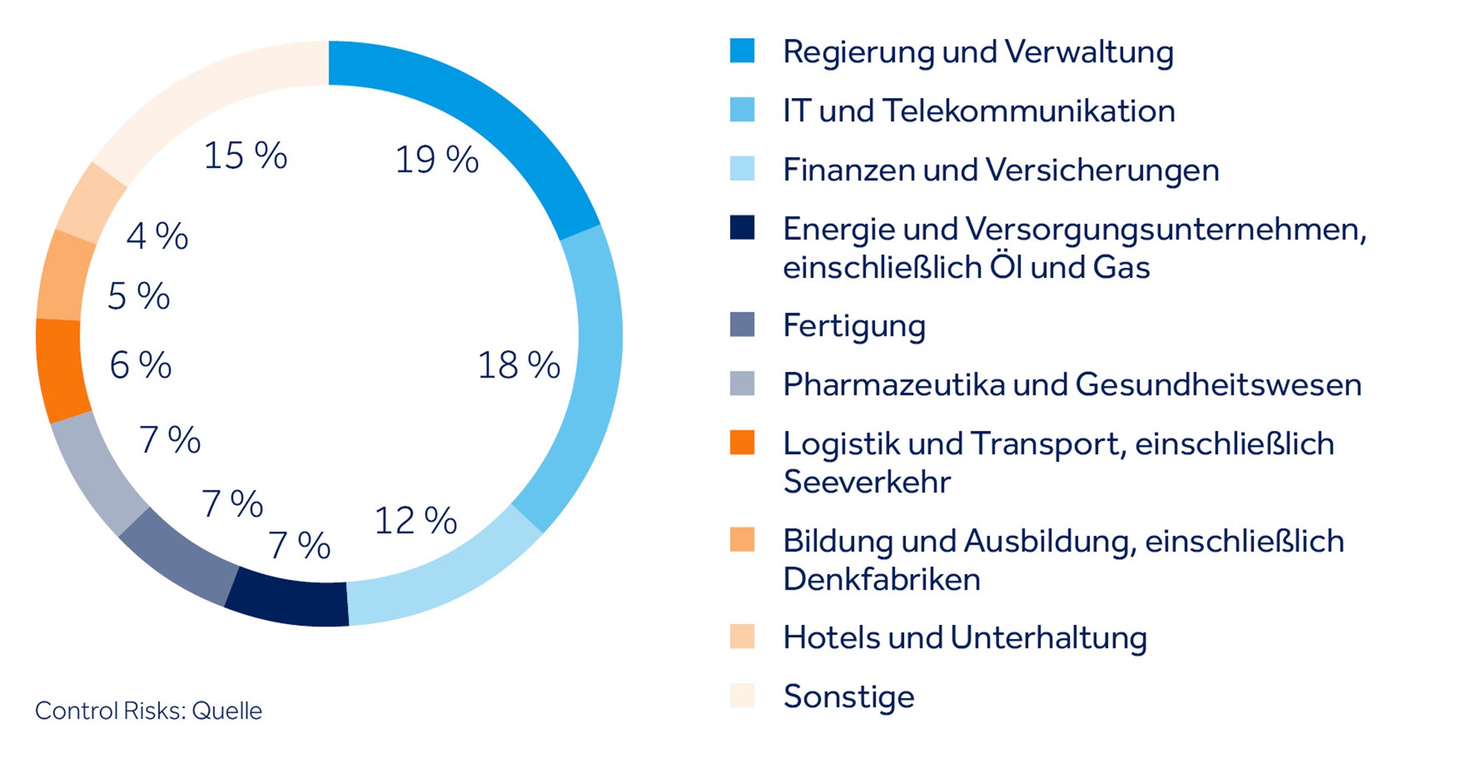 Am stärksten von Cybervorfällen betroffen waren im Untersuchungszeitraum staatliche Institutionen und die öffentliche Verwaltung (19 Prozent) (Grafik 2), dicht gefolgt von IT- und Telekommunikationsunternehmen (18 Prozent). Auf Platz drei liegt mit 12 Prozent die Finanz- und Versicherungsbranche, die aufgrund sensibler Daten und direkter finanzieller Schäden besonders im Fokus von Angreifern steht. Für Deutschland, wo diese Sektoren eine zentrale Rolle für Wirtschaft und Gesellschaft spielen, verdeutlicht dies die dringende Notwendigkeit robuster Sicherheitsstrategien.
