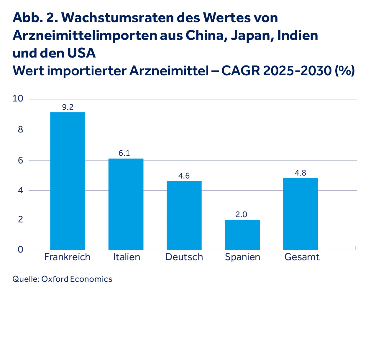 In Deutschland liegt die Importquote mit 16,1 Prozent (Grafik 1) deutlich über dem europäischen Durchschnitt – trotz einer Steigerung der eigenen Produktion um 4,1 Prozent. Damit zählt Deutschland zu den Ländern, die besonders stark auf Arzneimittelimporte angewiesen sind – ein Risiko, das durch geopolitische Spannungen und hohe Energiekosten weiter zunimmt. Prognosen zeigen zudem: Bis 2030 dürften die Importe aus China, Japan, Indien und den USA jährlich um 4,6 Prozent steigen (Grafik 2). Noch dramatischer ist die Lage in Frankreich, wo die Werte sogar um bis zu 9,2 Prozent im gleichen Zeitraum klettern sollen – bei einer nachlassenden Produktion (-2,8 Prozent).