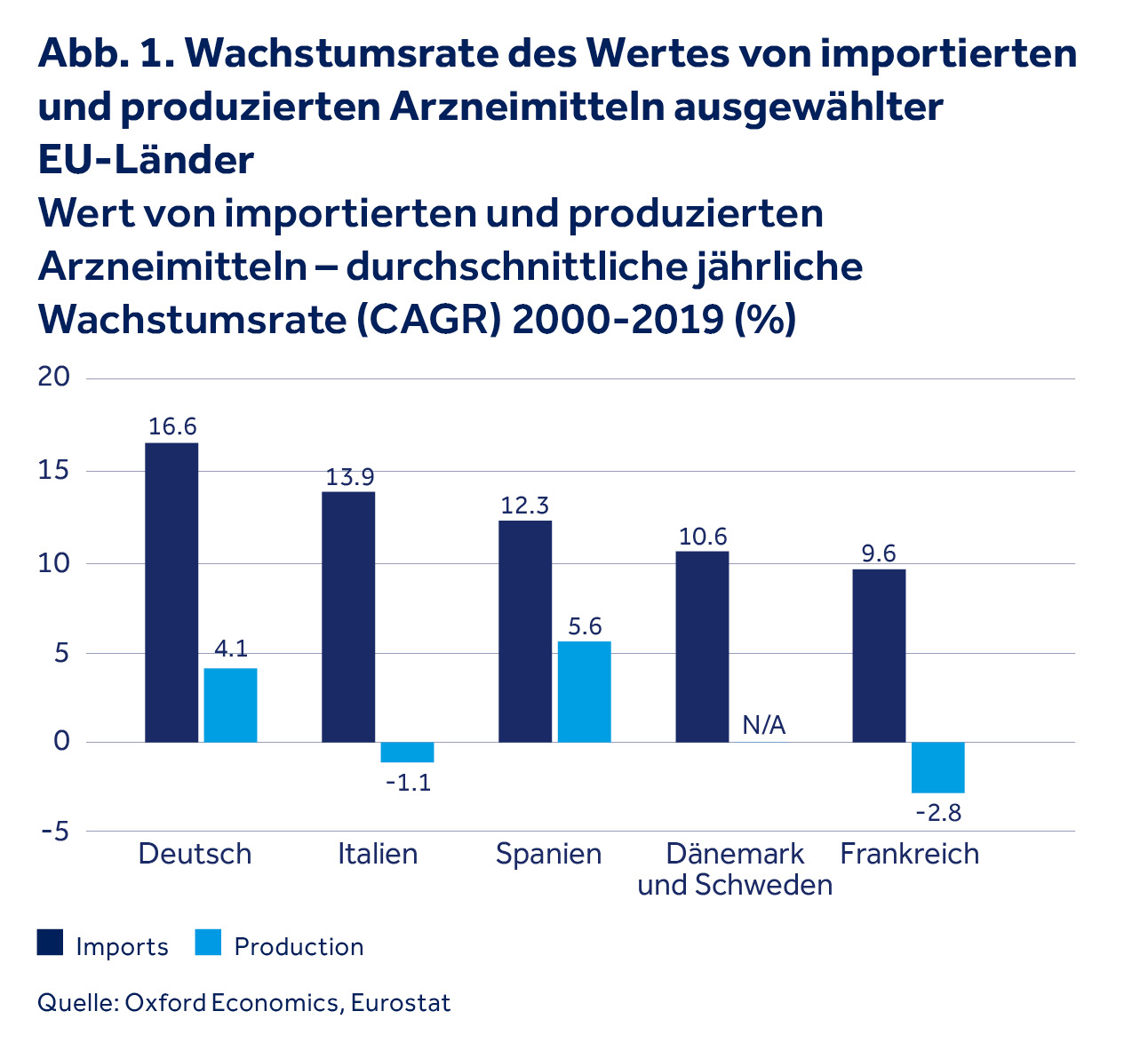 So sind fast 70 Prozent aller in Europa abgegebenen Medikamente Generika. Doch ihre Vorprodukte, insbesondere Wirkstoffe (APIs), werden zunehmend außerhalb der EU hergestellt. Zwischen 2000 und 2019 stiegen die Arzneimittelimporte in Frankreich, Italien, Deutschland, Spanien, Dänemark und Schweden jährlich um durchschnittlich 13,3 Prozent, während die inländische Produktion lediglich um 0,8 Prozent zulegte.